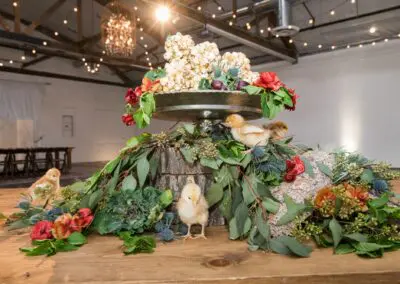 - Turn “junk” into decorations. Gaia Flowers used PVC for the hanging arbor; materials that were left over from a project. They even used an old hanger found by the side of the road. These were paired with outdated gardening tools for a one-of-a-kind chandelier.